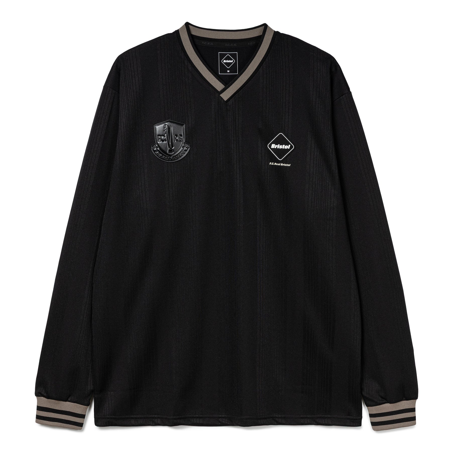 This new long-sleeved game shirt features a jacquard stripe in the same color as the body, created using luxurious bright yarn for an elegant sheen. The right chest features a trophy patch, a symbol of the new Exhibition model, and the ribbed neck and sleeves add a classic touch.