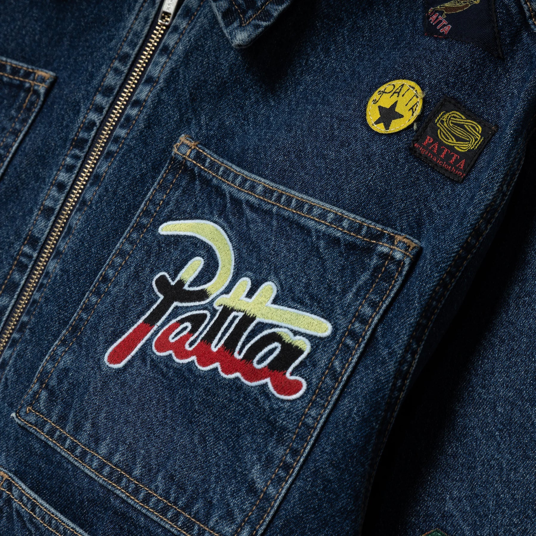 The Patta Whole Lotta Labels Denim Jacket is crafted from 100% Cotton Denim. This jacket serves as a distinctive highlight in any wardrobe, featuring extensive Patta-branded patchwork across the fabric. Additional refined details include a YKK zipper, Back clasp for adjustment and 4 large pockets, enhancing their signature appeal.